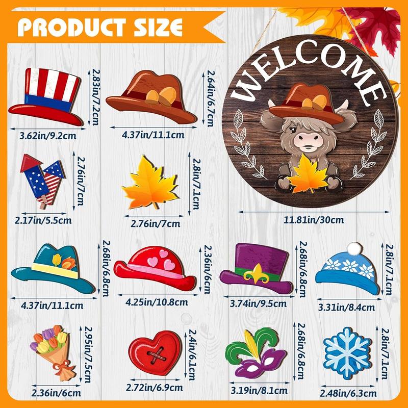 Interchangeable Highland Cow Welcome Sign for Holiday Seasonal - These cute set include 1 round sign + 17 magnetic hats and 17 accessories. So cute interchangeable seasonal decor for your home!