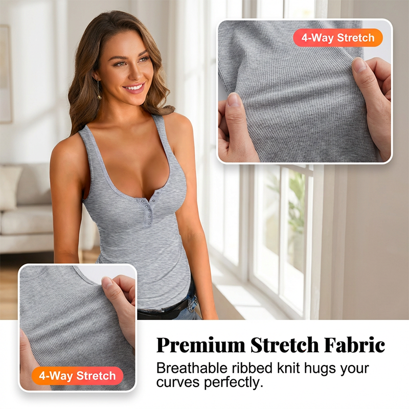 SCOOP NECK WITH BUTTON PLACKET - The classic Henley style adds a touch of visual interest, elevating a simple tank top. It allows you to adjust the neckline for different looks, offering both style and versatile comfort.